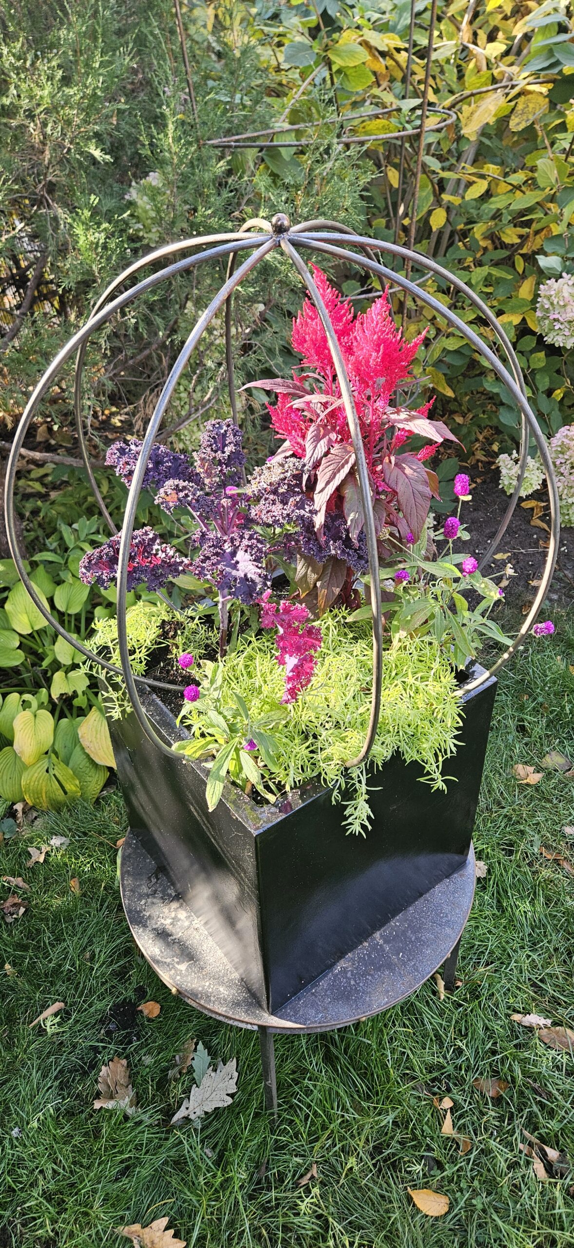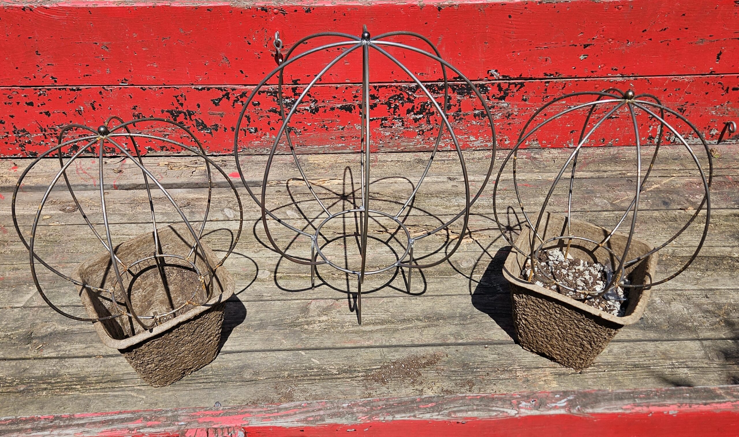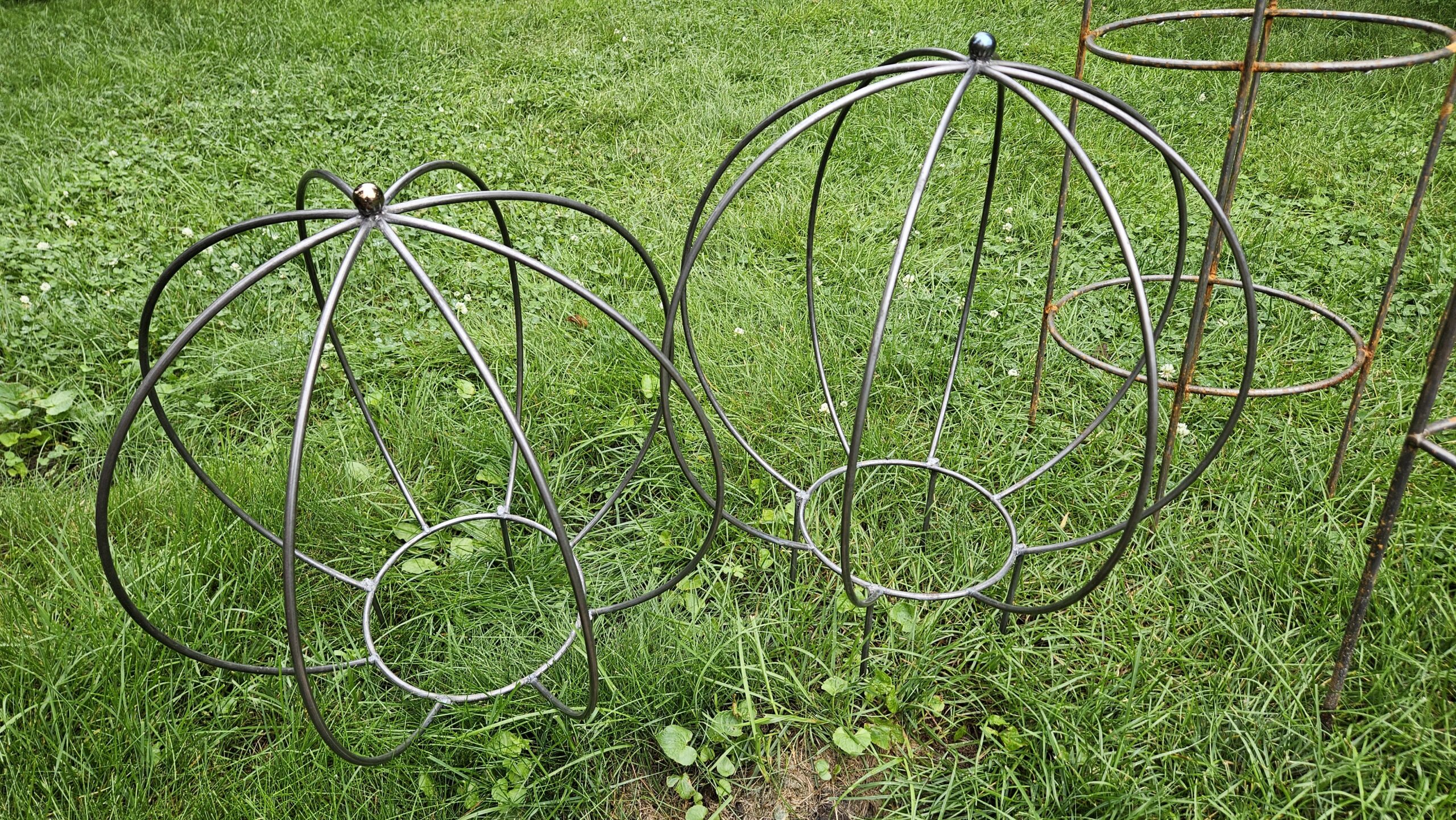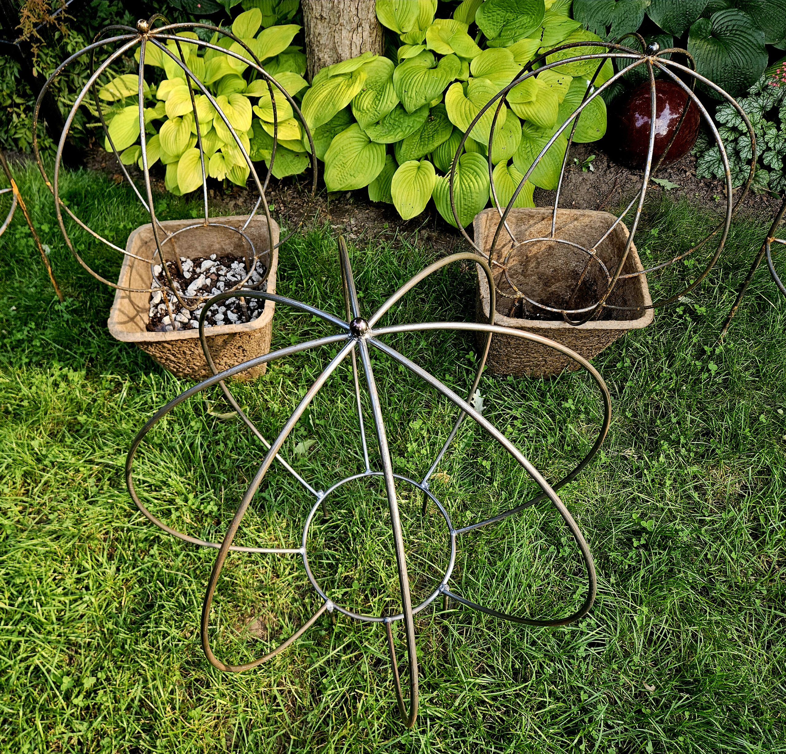 The biggest size I can currently make. 32″ diameter sphere with flat, open bottom for easy planting access and 10″ legs for anchoring into ground soil or container/planter bed. Simply push legs into soil until horizontal ring is at soil surface and install your plants!